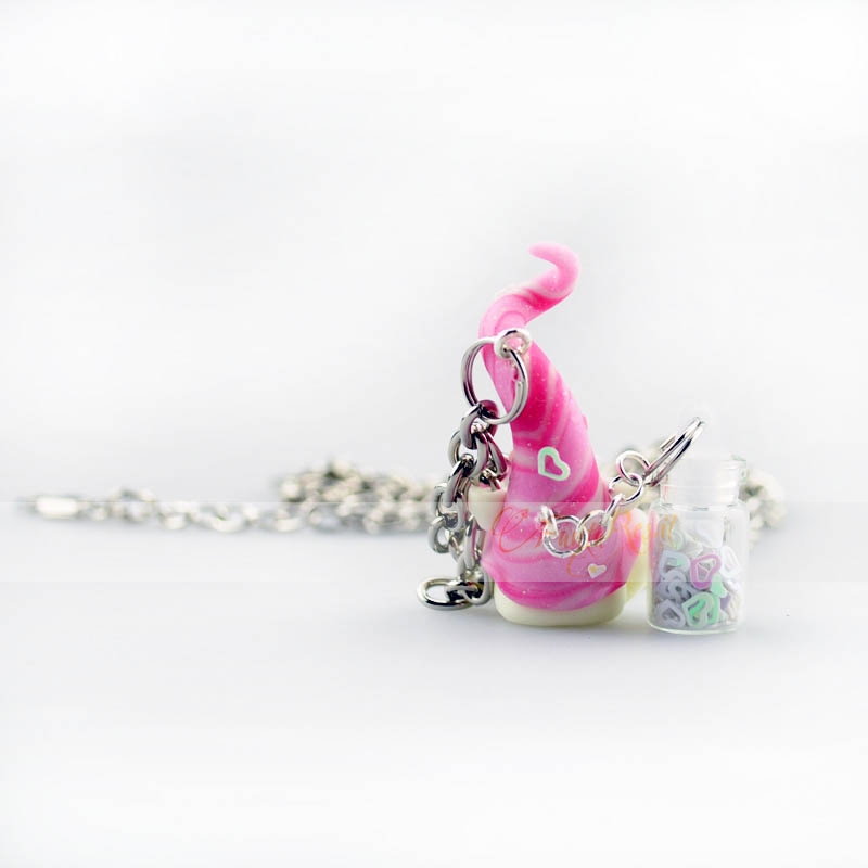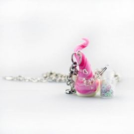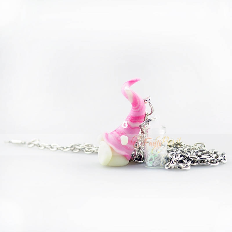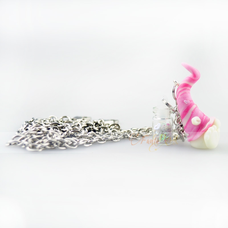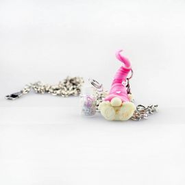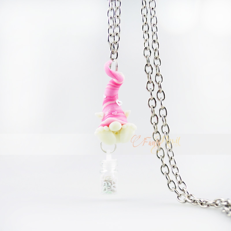 Elfo fuxia con bottiglina pozione LOVE, realizzato a mano in fimo. Catenina non inclusa!!!