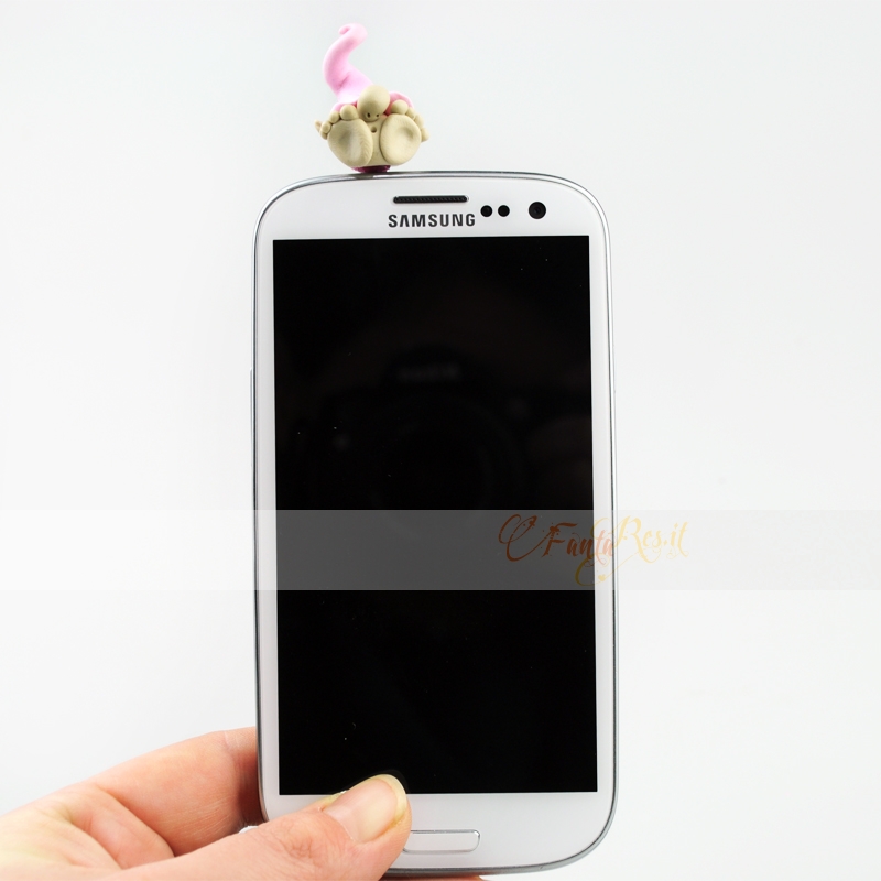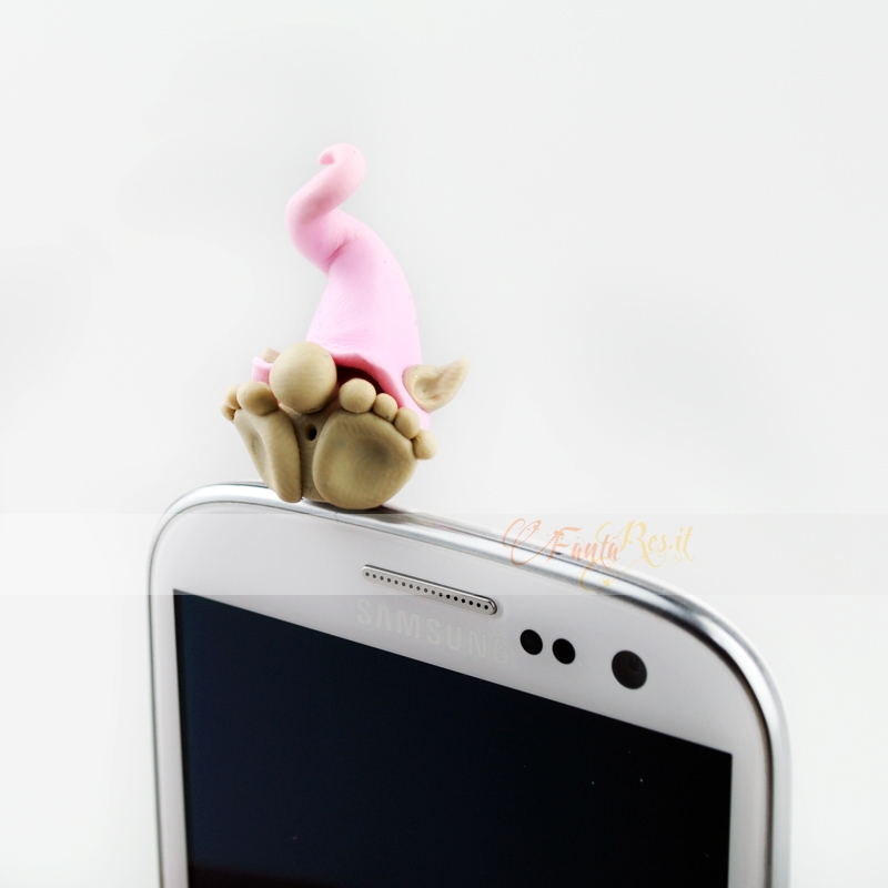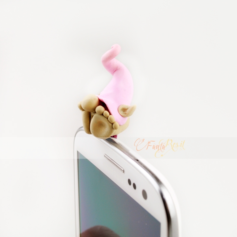 Simpatico elfo che si illumina al buio e che proteggerà il vostro cellulare o notebook dalla polvere. Possiamo realizzarlo in tutti i colori che volete. Indicateci il vostro colore preferito e il nostro elfetto vi proteggerà dalla sporcizia :D Tappino (gommino) anti polvere per proteggere il jack dell'auricolare e impedire l'ingresso di polvere. Adatto a ogni entrata jack da 3,5 mm, utilizzabile anche per notebook o palmari. Realizzato in fimo, possiamo personalizzarlo con la vostra iniziale o con un charms