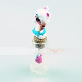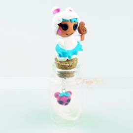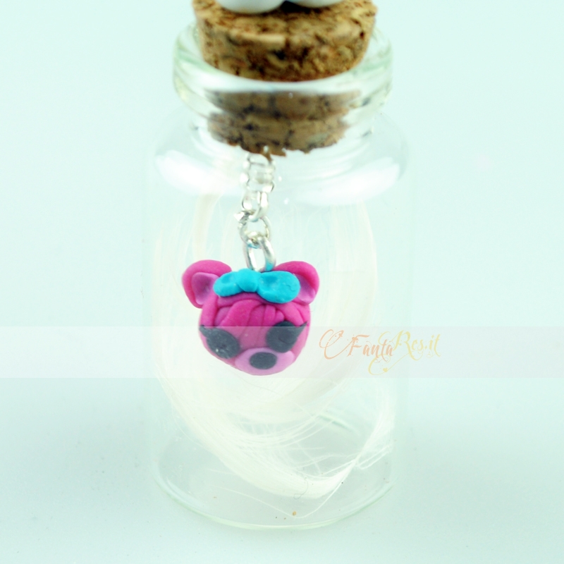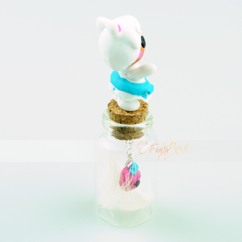 Nella bottiglina ci sono piume e il ciondolo animaletto della bambolina.