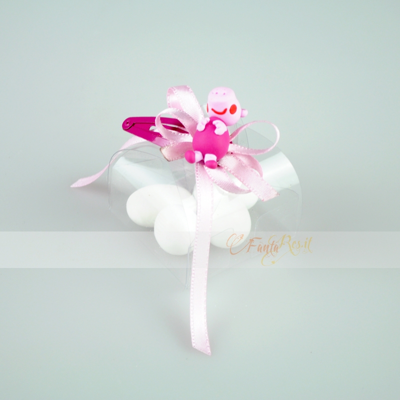 Bellissima idea bomboniera di peppa pig, fate felici i vostri bambini con questa maialina rosa che è molto smorfiosa e prepotente. Adora saltare su e giù nelle pozzanghere di fango e giocare con la sua migliore amica Suzy Pecora alle fate e alle principesse. A volte litiga con Suzy e spesso con George, il fratello minore. A volte aiuta a risolvere problemi e si arrabbia molto facilmente.