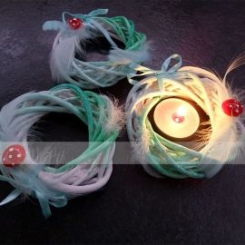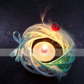 Base in vimini intrecciato di colore bianco, con sfumature in verde tiffany e piume e funghetti portafortuna.